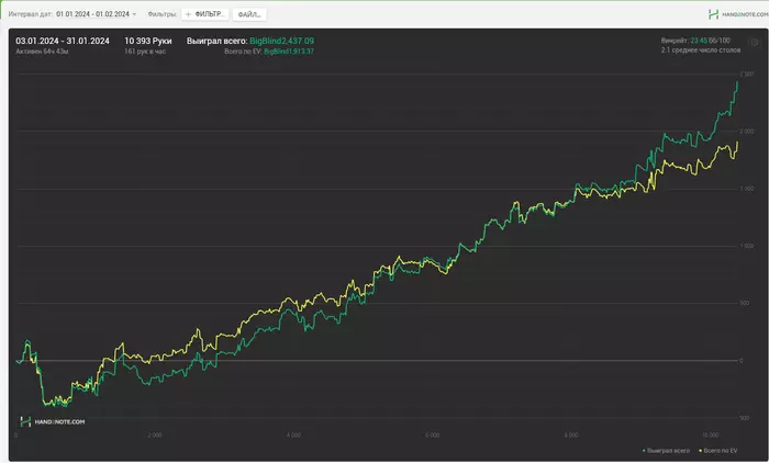 Общий профит составил около 2000$. В общем начало года положено, январь я нормально поработал, хоть дистанция и не большая, после болезни вошел в режим, избавляюсь от тильта и пробую закрепиться на NL200. В плане дистанции февраль нужно сделать более продуктивным...