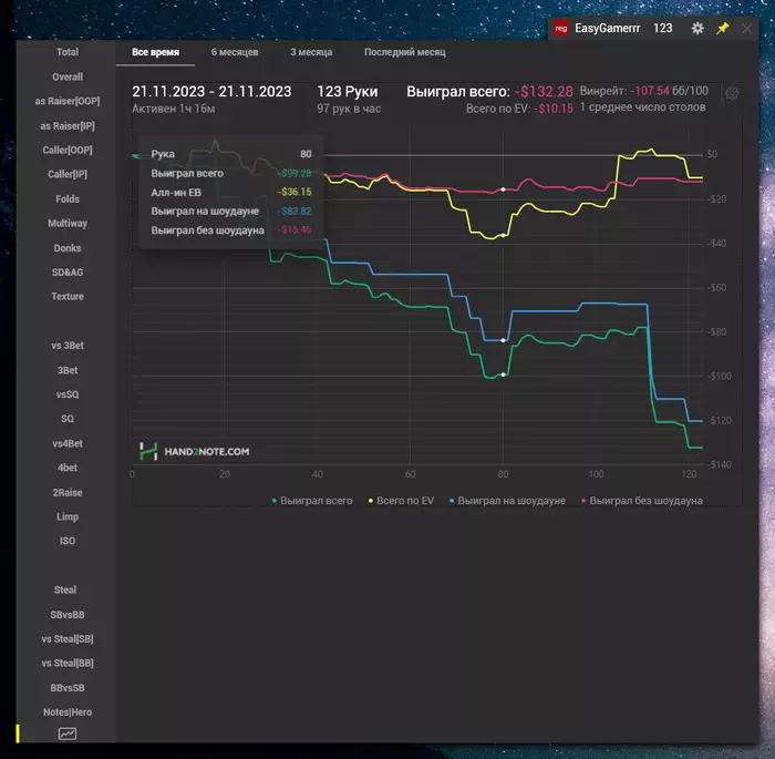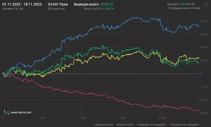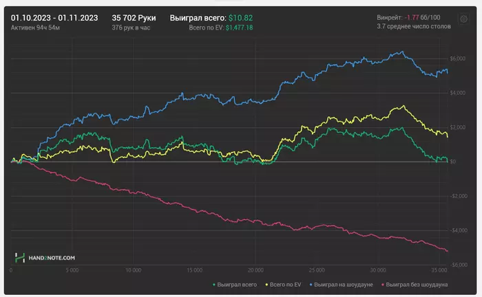 Реально, такой концентрации доездов терн/ривер в 2-3 ебаных аута я уже давненько не видел. Плюс челы, хитающие 2 пару со флопа, вхолодную заколив 3бет на В7. от души блин. Притом что в этом месяце самая диспа на старзах. График ее не отобразит, но наибольший негатив к игре принес этот замечательный рум! Который еще и "оптимизировали" настолько ахуенно, что раньше можно было играть 24 стола на слабом ПК. Сейчас же попробуй комфортно 4 поиграй) но это тема отдельного поста. В итоге плюс в октябре получился только за счет редстара.