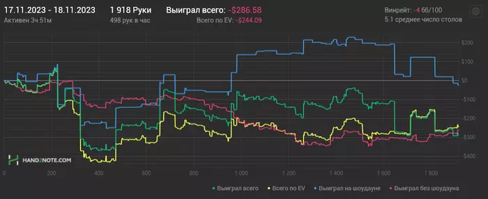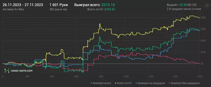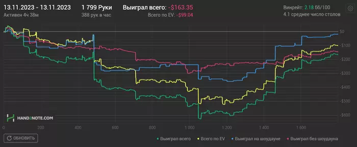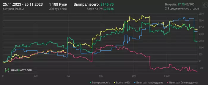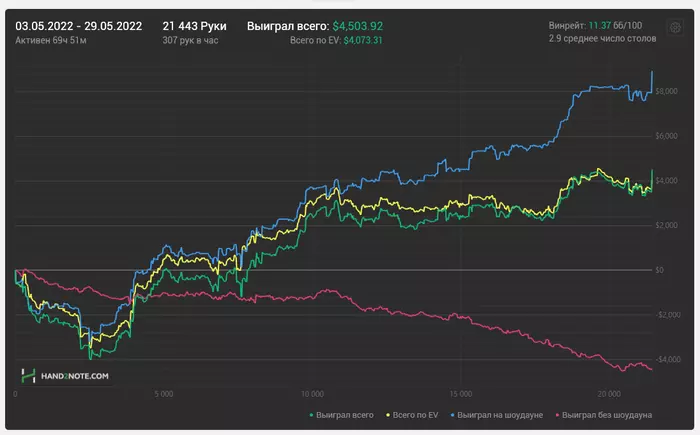 Включил антикризисный режим. Для этого стараюсь откатывать дистанцию. Возвращаю проверенный подход: ставлю цель по отыгрышу часов. Результаты НЕ смотрю! Так психике гораздо легче. Главное не сорваться. Но если реально отталкиваться от цели в почасовке, то на резы краткосрочные пофиг. Как показывает практика, они придут. И в этом, и в прошлом году у меня были стрики. Но все в итоге сводится к среднему $/час. Поэтому надо прикладывать усилия по наигрышу, работе над игрой и все будет в шоколаде)