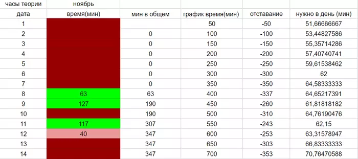 25 часов в месяц достигаются при занятии теорией всего 50 минут каждый день. Но чем больше забиваешь, тем больше времени надо уделять. НО! полезно что я сделал такую визуализацию для себя. Кажется, что очень много потеряно. Но по факту не особо критично. По 66-70 минут и цель будет достигнута. Главное постараться. Я думаю, в этом месяце я выполню 25 часов теории. Как минимум я показал что могу собраться на примере откатки 13 часов. Надо будет "догринжу" теорию.
