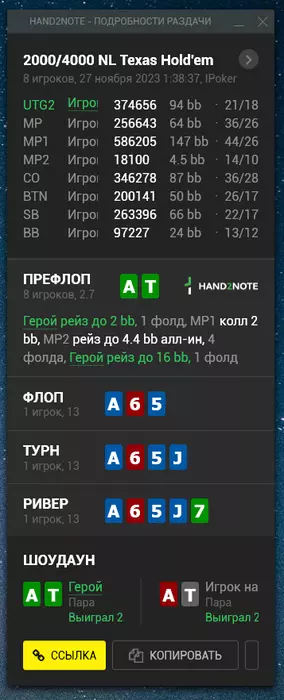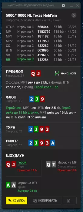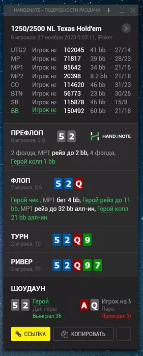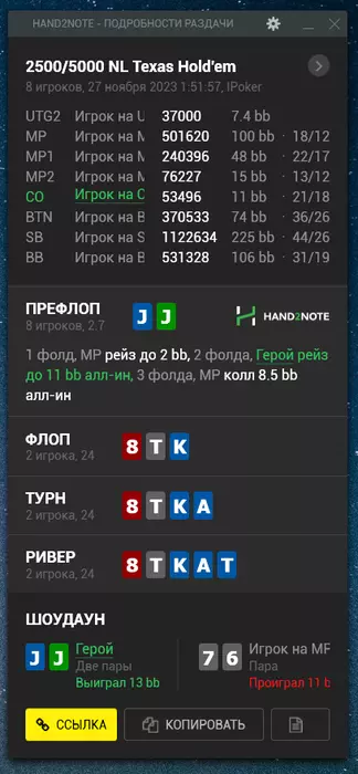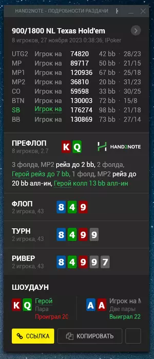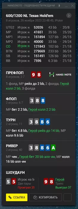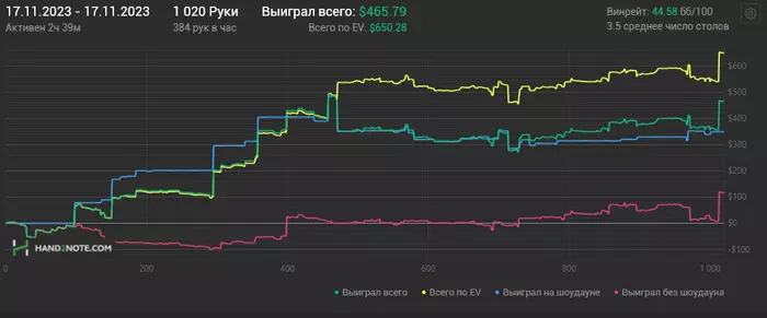 Турик решил играть мейн нокаут 55к гтд. Его перенесли на неделю Будет идти 26 ноября. Как раз постараюсь азы нокаут туриков изучить до мейна. И надеюсь поможет оформить хороший месяц) Но, естественно, больше надежд на кеш. Сотку для меня гораздо комфортней играть. Даже банально играть 1 лимит с точки зрения диспы проще играть. Потому что ты как выигрываешь стек 100, так и проигрываешь 100. А не так что на сотке выиграл 100 бачей. А на двухсотке стек 200 (спасибо кэп блять). И вот ты можешь выиграл стек + проиграл стек, а профит -100. Понятно что может быть и наоборот. Ну уж простите меня, так складывается, что мышление пока что такое. Тут проще даже из-за большего количества фишей + не все реги 100 играют 200. Чуть попроще уровень оппозиции. А чтобы не расслабляться, отмечаю спорные раздачи, даже если выиграл. И разбираю их потом. Посмотрим к чему меня это приведет. ГЛГЛ.