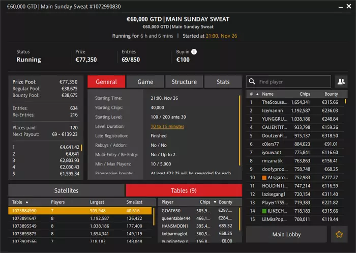 Мне нравится мейн. Там по 15 минут рост блайндов в начале, потом 12, и минимум 10. Стартовый стек 125бб. Есть еще E14|75000|Afterparty. Там стартовый 250бб, но блины чуть быстрее растут. Хочу прыгать в турик с самого начала, чтобы свой скилл на максимум использовать. Единственное что это оба нокаут турниры. А есть турич поскромнее, но очень плавный по структуре и без ноков.