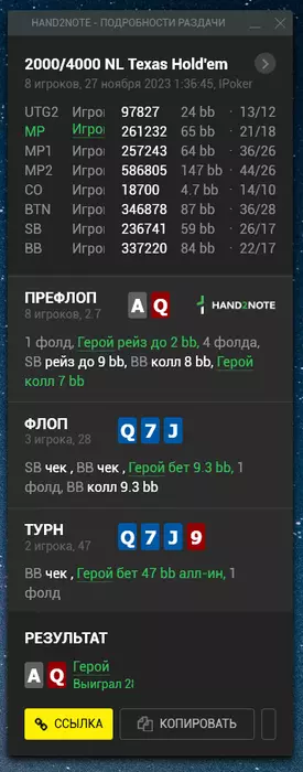АИ префлоп смотрелось бы солидней. Но за спиной крупный стек. Поэтому ставим 3бет без фолда на пуш.