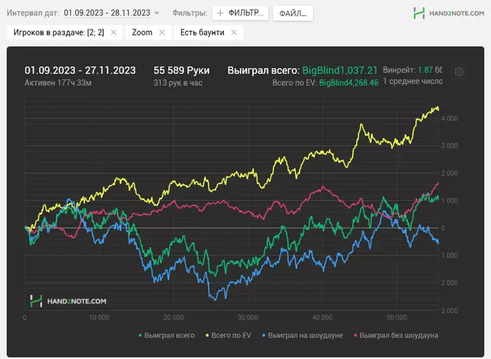 Один в один моя ситуация. Без алко с 1 сентября и откатал за этот период в ноль. И что интересно, я в прошлом году так же с 1 сентября отказался от алкоголя и полетел в пропасть по профиту, через месяц не выдержал этой нагрузки и сдался. И через неделю вернулась плюсовая игра. Сейчас вот 3-ий месяц отказа и сентябрь -20 БИ стрик (у меня кеш), к концу месяца немного отмазался. Октябрь средний плюс, и вот ноябрь -5бб/100 и -15би за месяц, уже вряд-ли отмажусь. Как будто мир проверяет - "а ты точно решил не пить? ... и теперь? ... и даже вот сейчас!!?"