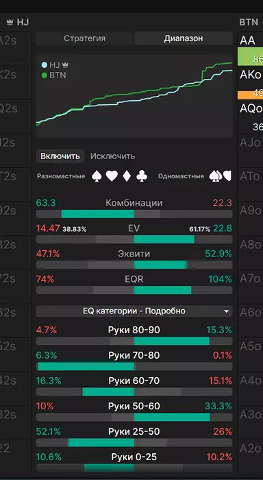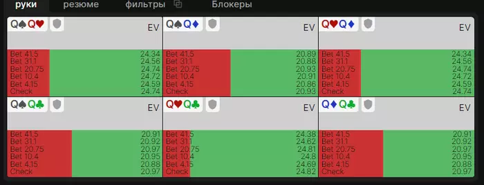 Но с этим можно запутаться (если все ветки не разобрать), поэтому страту можно упростить. И плясать от игры оппонента и нашего прямого эквити. Например, оставить только 1 сайз, оверкарты с мастью всегда бет (на терне в масть продолжение агрессии) , оверпары с мастью всегда чек (тк не боимся флеша), чем ниже оверпара, тем чаще бет и тд. Рука будет сама себя играть.