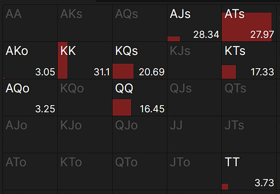вот так колит солвер, понятно, что рендж человека, скорее всего, будет отличаться, но основа ренджа все равно будет AQ, QQ, JJ, ну и думаю, что TT и JJ может оказаться больше в рендже чем тут, исходя из этого, думаю, что пуш плохим оказаться не может если опп не будет колить TT