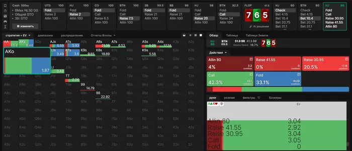 BSOD094, К сожалению, возможности полочить стратегию в каком либо солевере у меня нет, но EV пуша с QQ на флопе в зависимости от мастей, везде от лучшего действия разброc от (-0,05 ev до -0,44 ev) в симуляции, где на пуш фолдятся все TT и чуть больше половины JJ и если ты считаешь, что эти руки нажимают колл, то этот пуш выростит по ev и скорее всего больше чем на 0.5 ev, то что я так не сыграю никогда с AA факт и если считать, что TT и JJ колят всегда, то пуш с AK становится плохой. По поводу блефа с AK, то что их нет смысла блефовать, это не совсем так он их иногда ставит на флопе, он нередко их пушит на мелки бет на флопе от оппа, и во многих ветка, с подходящими мастями он бетит, рейзит AK, его ev на флопе 5.9 и оно берется не только в тех случаях где ты доехал или выйграл на шд, и правильно сыграть эти линии достаточно сложно, а лично для меня еще сложнее найти правильные блефкетчи с этимим AK