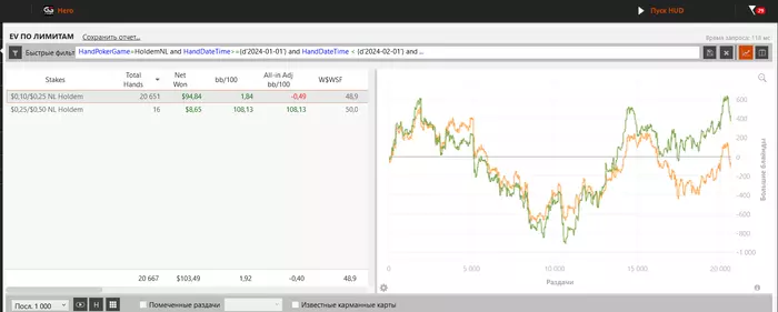 Сейчас сыграл наверное худшую сессию за все время. Я справился выставиться 4 раза против AA c AKs 2 раза с QQ и с KK и выставиться с дро против сета у фиша и это все за 200 рук еще и люди умудряются руки лучше выкидывать когда мне доезжает, не люблю нытье про диспу, но я реально не помню когда последний раз выставление префлоп на 100бб выигрывал, специально проверил последний раз 23 декабря, да я играл в январе не так много, но за 15 к рук 0 раз префлоп выставиться и выиграть стек звучит как пиздежь, но это факт, график за это время все равно +, но аномалия не прикольная
