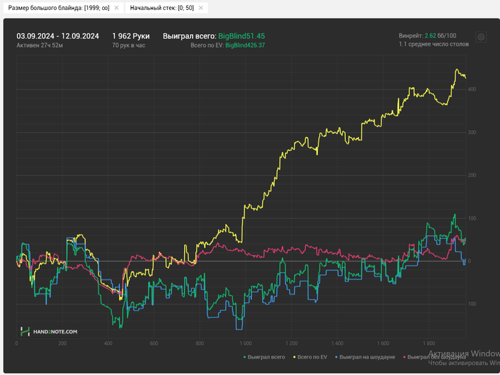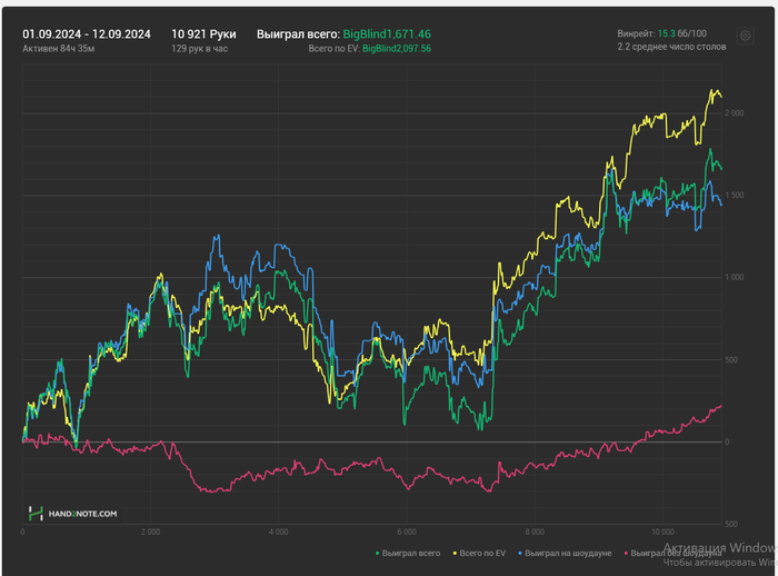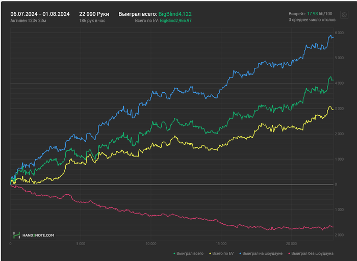 По прежнему объективно мало работаю над игрой, ограничиваясь просмотром видео из библиотеки фонда и изредка протыкиванием спотов после сыгранной сессии. Стал внедрять донки на флопе в игру, но пока не чувствую эти споты в полной мере и теряюсь на следующих улицах, но когда то в самом начале у меня было так с ч/р, так что несильно переживаю на этот счет, отшлифую. Просел трибет с баттона и открывашки снова уплыли не туда чуть, связываю с тем, что мало катаю с большими перерывами между игрой, думаю тоже пофиксится как только в нормальный режим войду.