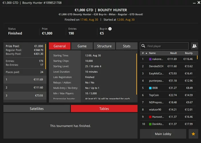 И сыграно 3 турнира 1 по 5€, 2 по 10€, на все эти турниры получил бесплатные билеты, 2€ баунти призовые