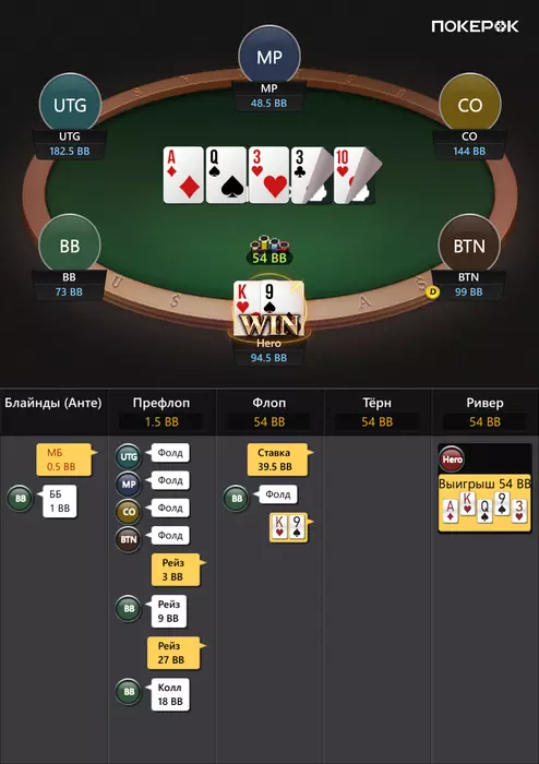 На флопе мой диапазон 4-бета идеально цепляется, часто тут AA QQ AQ KK AK ставят плотную на велью.