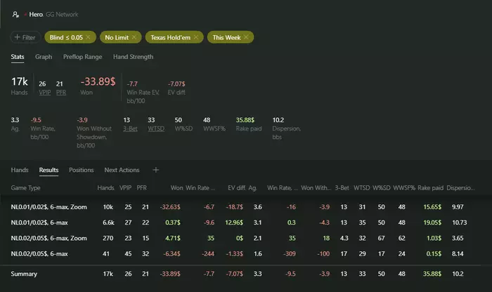 Что то плохая совсем неделя получилась. Надо больше уделить времени обучению. Много ситуаций где выставлялся старше префлоп, но просто флип не в мою сторону, а где то сам намудрил. Уделю на след неделе боьше времени софту и обучнению.