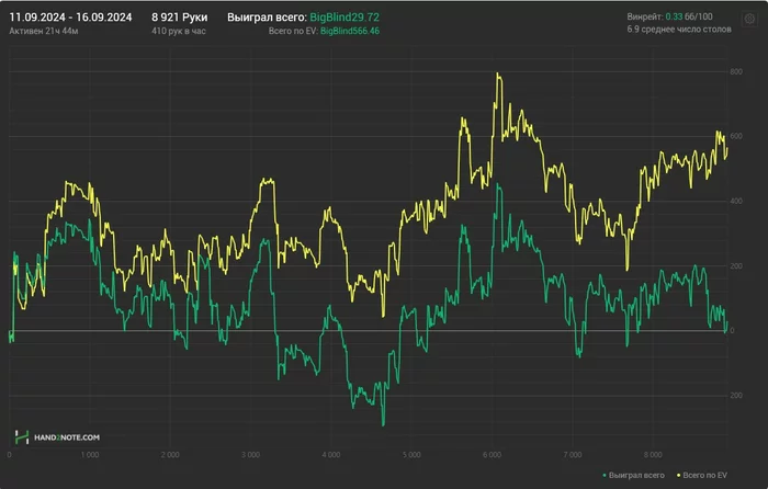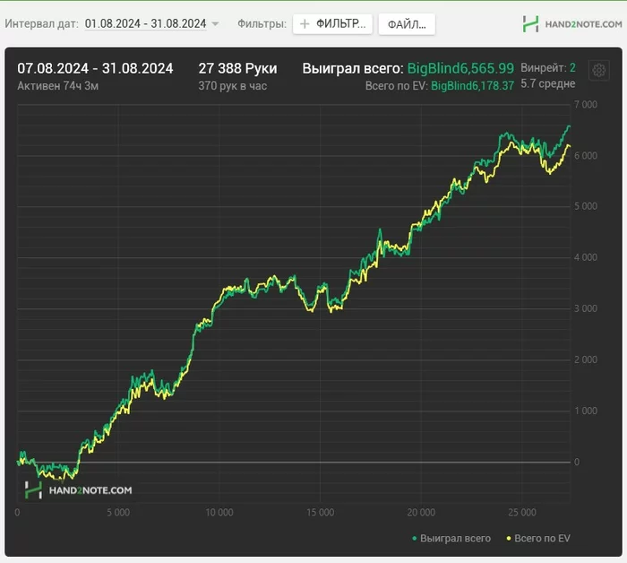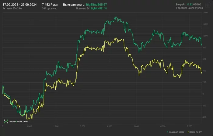 297 часов, почти 400к рук, профит со всеми плюшками (BBJ) +8684$ по курсу на конец месяца.