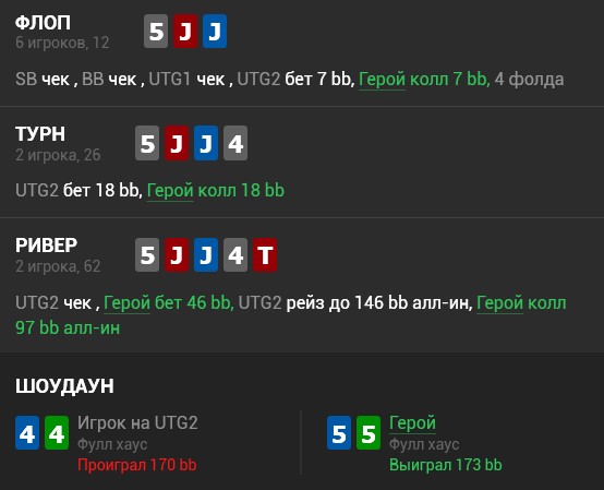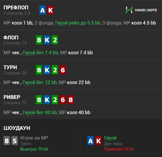 вот пример, что касается чуйки, стеки побольше 100бб, чел люба, обычно я ривер за фулл добор, но именно вот тут я подумал, что пахнет заносом и решил за мелкую ривер. ВАМОС!