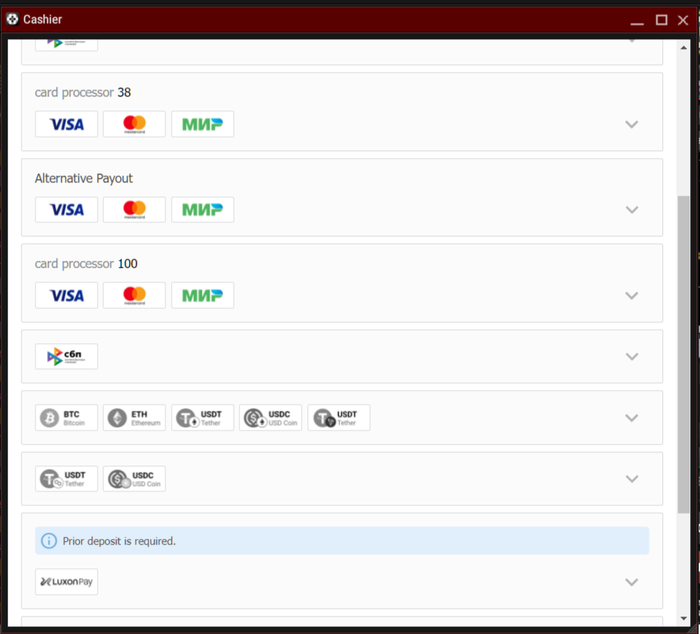 Мы рекомендуем выбрать Bitcoin или USDC/USDT, поскольку данные методы работают стабильно для игроков."