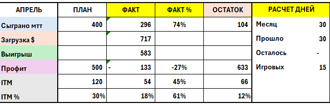 Итоги Апреля: минусово, очень мало времени было на игру, кое какие траблы в работе, про разбор полетов вообще молчу.