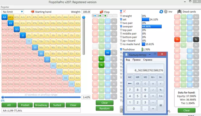 SUPERHERO86, у тебя 37% эквити, не 30% и выигрывать тебе нужно 36% (без учета рейка опять же). В реальности у тебя будет больше 37%, потому что мне думается, что здесь больше чем одна комба ФД пихнет, как минимум можно задать такое: