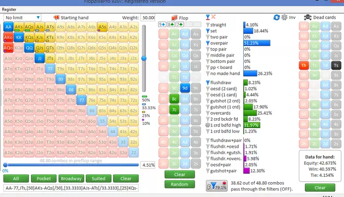 Если там будет хотя бы такое, то у тебя уже 42% эквити, этого нормально хватает. Не то, чтобы ты тут много бабок печатешь, но если выкидываешь, то оппонент тут нормально зарабатывает с твоего фолда.