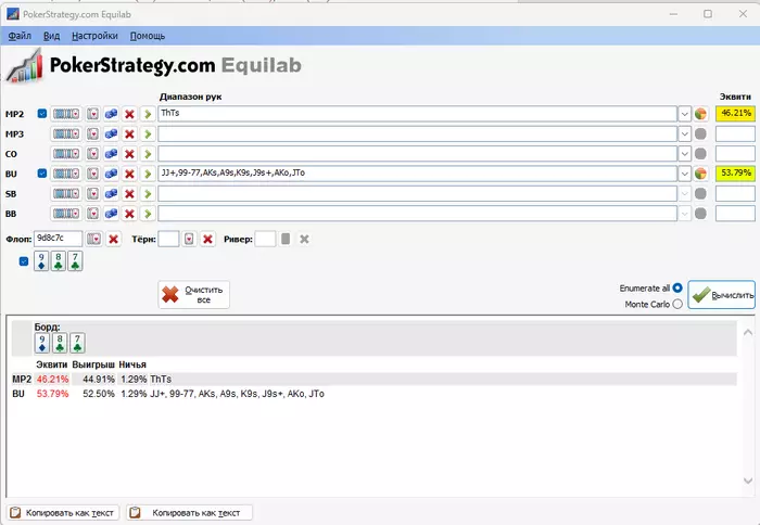 Это просто накинул прям самые топовые руки (двух пар у него тут быть не должно vs раней) ему, хотя 77-88 вряд ли будут (точно не полным весом), просто чтоб было понимание, если у чела практически нет тут блефов, у тебя без учета рейка кол в 0.