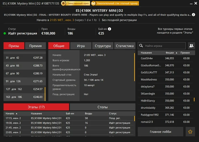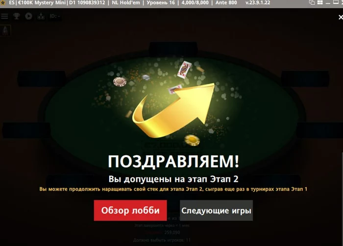 В одном из КО турниров на айпокере вытащил билет на Мистери по $25 ($100к гарантия). Методист сказал что буду играть полностью от себя, фонд на билет и профит с него не претендует. Отобрался во второй день, пронес честные 10бб. Мин. ИТМ 200-250 евро ожидаю, но думаю там будет 2 бай-ина, как это обычно бывает в двухдневных))