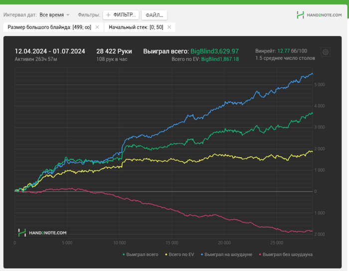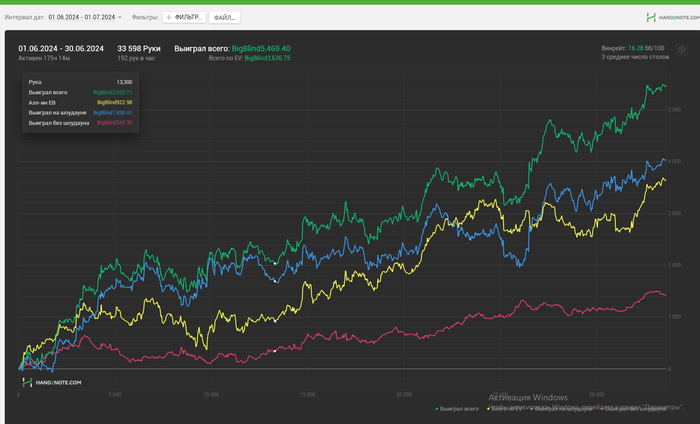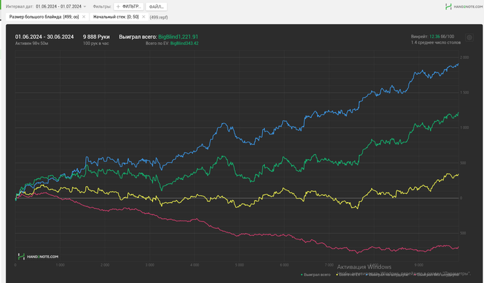 Июнь выделил. Накатал как будто мало, но с учетом мая > больше 800 турниров за 2 мес. Тут показывается июнь минус 33БИ моего аби, но по факту там в два раза больше. Закончил Июнь минус 660$ (66БИ) что-то такое. Весь месяц жил хрен пойми на что, хотелось бы конечно покером чего-нить заработать.