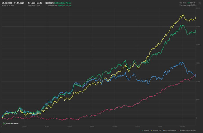 realdeal, в том месяце поэкспериментировал во многих спотах, был более пассивным постфлоп против неизвестных, избегал крупных блефов, и гораздо тоньше вельюбетил регов и фишей, чем ранее. Немного изменил ситуацию в этом месяце, и теперь обе линии в плюс. Напишу мб пост через несколько недель. Сейчас с тренерской рутиной свободного время стало куда меньше.