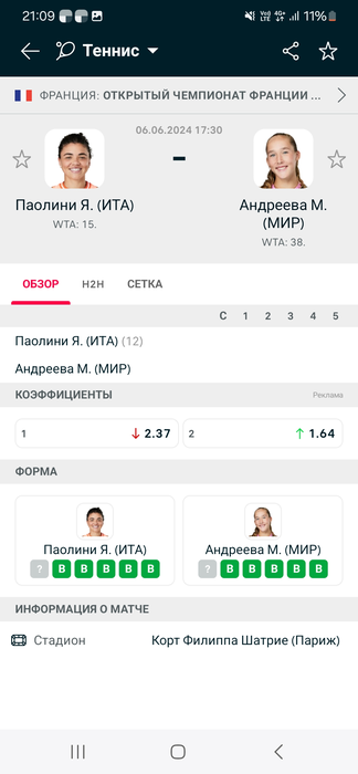 По сезону Паолини мне нравится больше. На грунте у Мирры преимущество, но небольшое. В личной встрече 2 плотных сета. В Париже вполне могут уйти на 3. В четвертьфиналах у меня были мысли: с форой по сетам на Паолини и по форе на Соболенко.