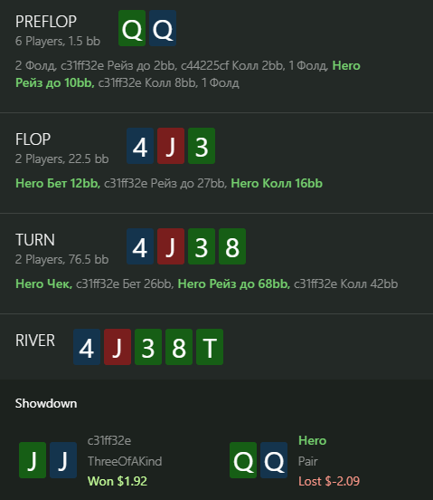 4) флоп явно не твой как рейзера. Рейзить не стоит. Можно даже о фолде начать думать прям на флопе. Это 3вей. У BB есть все сеты, стриты, 87s (а то и 87o). Вагончик комбарей.