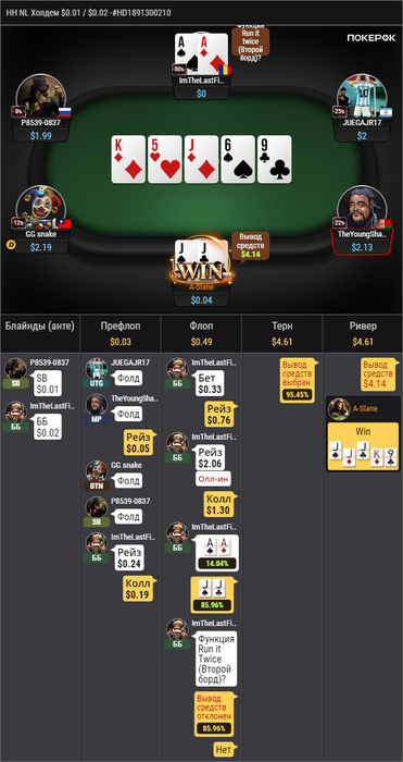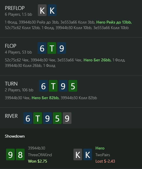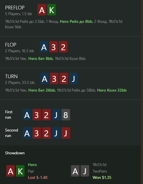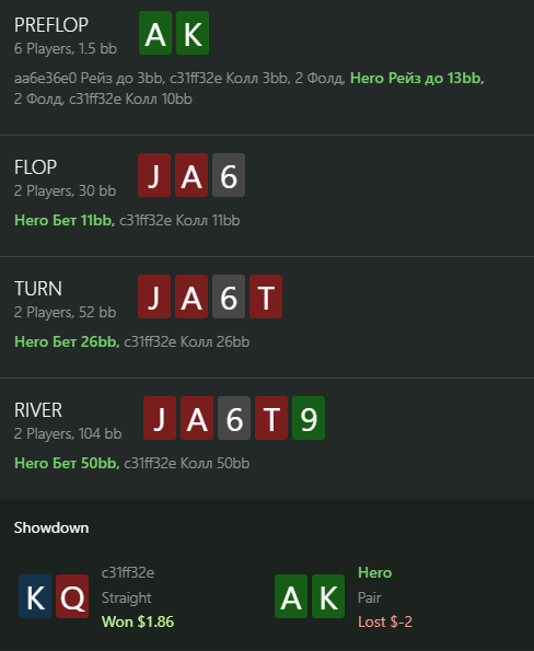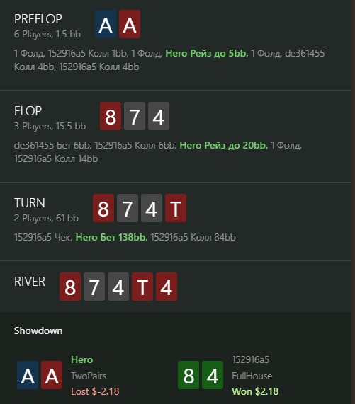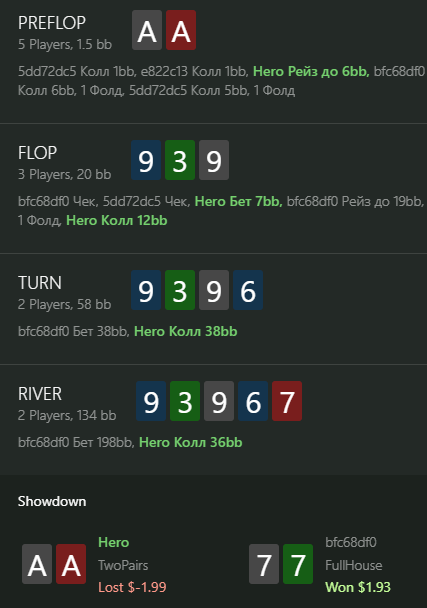 В первой раздаче как будто можно было пасовать, будь там 9 или 33, но там только ривером доехала карта, которая бьет мои тузы, а фолд на 36 бб в банк 130 бб я не осилил.