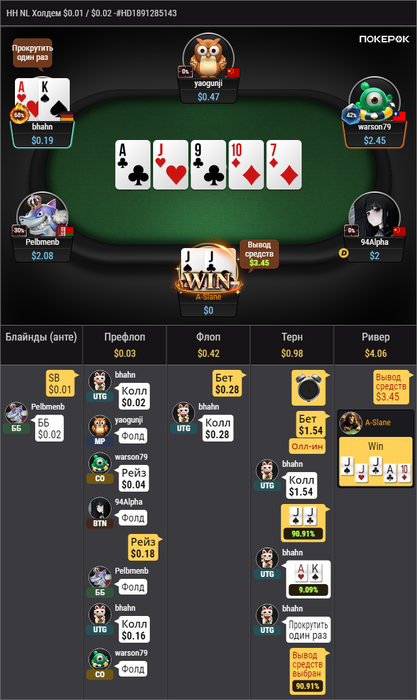 A-Slane @ 09.08.24В первой раздаче как будто можно было пасовать, будь там 9 или 33, но там только ривером доехала карта, которая бьет мои тузы, а фолд на 36 бб в банк 130 бб я не осилил.