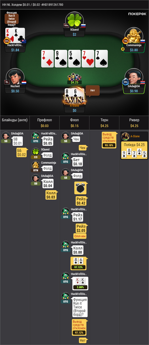Разок был обратный кулер, когда я сыграл рейз-пуш ривере, а у соперника оказался неочевидный фулл-хаус