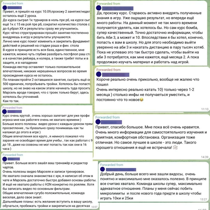 👤: В целом, мне все нравится, с каждой треньки можно узнать что-то новое для себя. Их там очень много в записи пересмотрел наверное 10% от всего что есть + каждую неделю новые общие и индивидуальные, еще и в группах по 2 человека, так что теории хоть отбавляй. Но не стоит забывать что все еще зависит в большей степени от нас самих и нужно индивидуально очень много времени сидеть в хрк что бы улучшить свои результаты. Я бы еще добавил совместные разборы записей лайф сессий в группах по 3-4 человека, где каждый по очереди выкладывает запись своей игры и совместно смотреть обсуждать было бы хорошо.