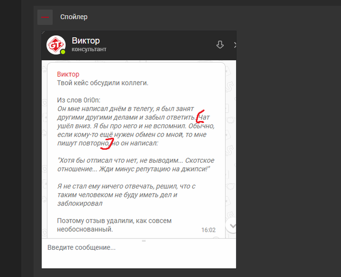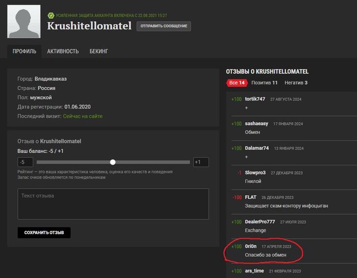 Hikaru, ты по факту будешь отвечать? Или это и есть все твои аргументы? Ты в разделе арбитраж, приводи аргументы, я тебе по факту написал, но все что ты можешь высрать это отзыв в моем профиле от ориона. Не знаю в курсе ты или нет, но после обменов успешных, люди друг другу часто отзывы оставляют.
