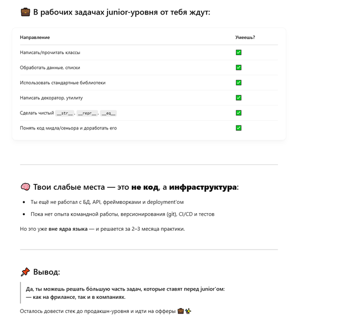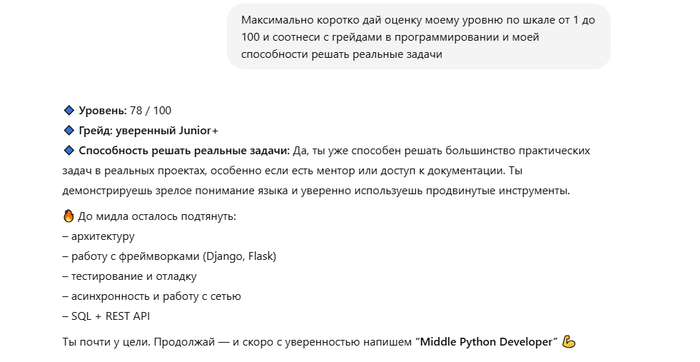 А по грейду - я к оценке своего уровня со стороны гпт отношусь с определённой долей иронии. То есть, очевидно, что на практике я не junior+, так как банально нет коммерческого опыта разработки. Просто исхожу из такой позиции: если есть теоретическая возможность стартовать сразу с junior+ позиции с зарплатой $1200, пусть даже через накрутку опыта и прочие шорткаты - то это надо делать т.к. это просто плюс ев)