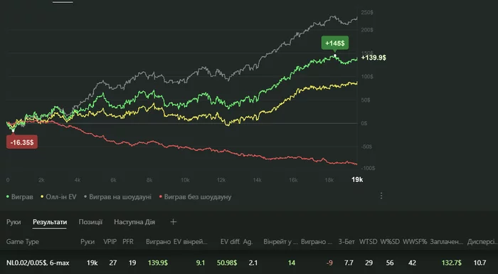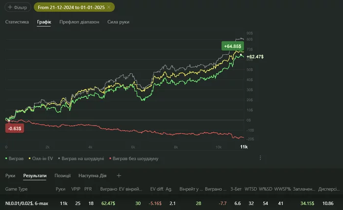 С начала 2025 года я начал катать НЛ5. Сначала было трудно перестроиться: много 3-бет-потов, даже 4-бет-поты стали появляться. Но за 2 недели катки и обучения вроде разобрался, как бить этот лимит. Думаю, до конца месяца останусь на НЛ5, а потом перейду на НЛ10.