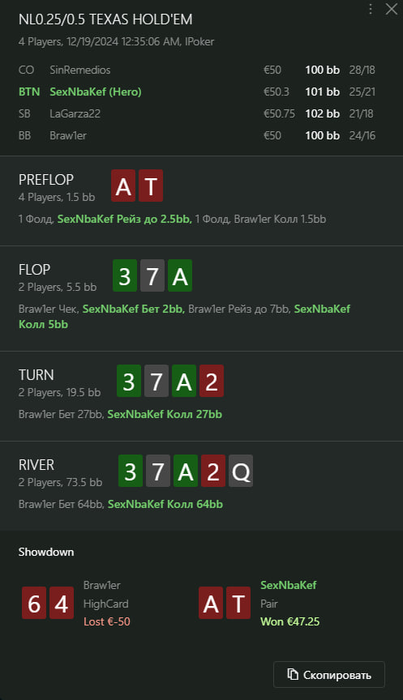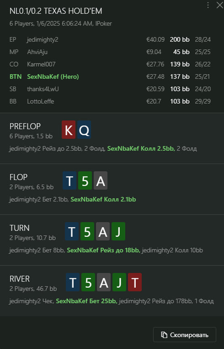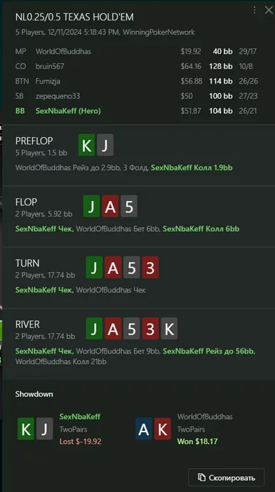 NikAlexandr56, Ну, с учетом рейка, пролезет колл или нет, там прям на тоненького-тоненького если. Не думаю, что фолд - грубая ошибка, это реально около нулевой колл