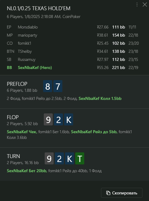 SexNbaKef, Префлоп можно 50/50 3бетить. Флоп ч-р с фд хотя бы с оверкартой к 9, 87 фд всегда б колил. Терн овербет окей, но рейз всегда колим, т.к по оддсам на флеш лезет и что самое важное, опп капается на флеши своим рейзом (ну мб только QJ есть) и по доезду во флеш, донк пушим