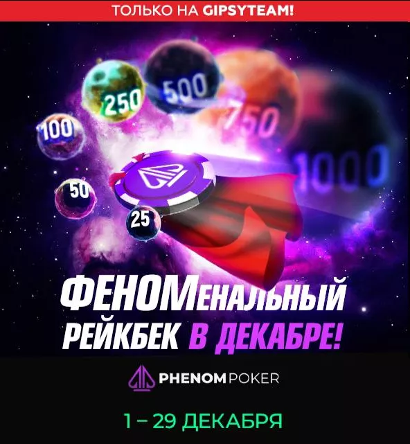 С 1 по 29 декабря играть на Phenom Poker станет выгоднее: можно зарабатывать до 1,000 бонусного рейкбека за любыми столами.