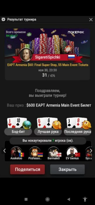 Поиграл туриков 30 где-то, в Мейн за 5000р. отобрался в нём с АА вышел прогуляться))в общем каталось плохо и накатался в минус -5600р., а у Блефача в розыгрыше выйграл 60$ случайно на Сат. в 600$ в Мейн в Ереван(оффлайн) и в нём забрал билетик один из 55