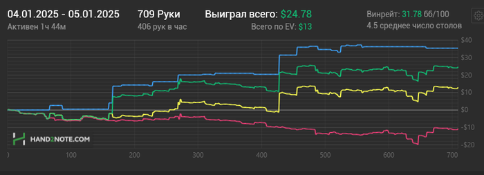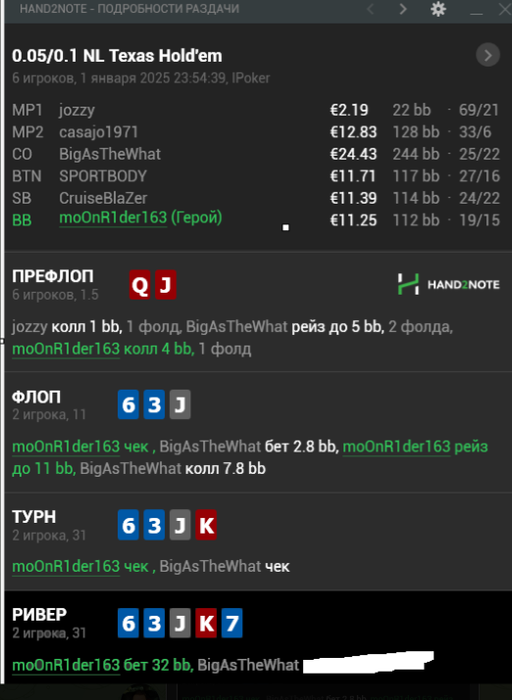 MoonR1der, Не хочу, чтобы ты меня неправильно понял. Я без негатива, наоборот с наилучшими пожеланиями. Раздача просто очень показательная. По ней видно, что ты и в других раздачах играешь не туда, скорее всего. Хорошая новость, что исправить это не так уж и сложно. Попробуй логически подойти к каждому своему действию - сам найдешь у себя кучу ошибок! Извини, если грубо выразился. моя вина, что мысль плохо донес.