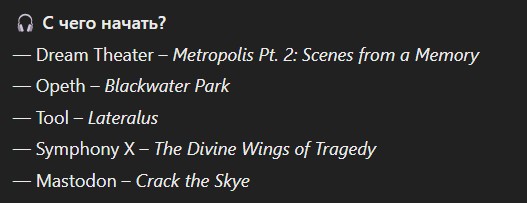 P.S. ChatGPT предложил для погружения в прог послушать вот эти группы и альбомы, как вам? Как по мне, довольно неплохо