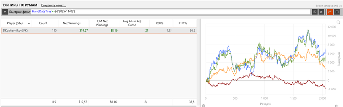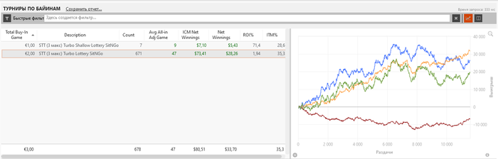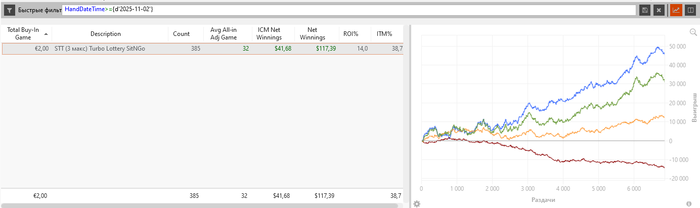Октябрь закладывал на освоение, так как немного другая структура турниров и есть анте. В целом рад тому что не в минус, хотя это заслуга только лишь одного множителя х50. Сложности возникли в ранней стадии - ребята просто не знают кнопки фолд на первом уровне, поэтому сильно просел по красной. Так же была попытка игры без горячих клавиш на 4 столах, там тоже получил за то что не успевал и уходил в сит аут на поздних улицах и дарил фишки, ну и вишенка на торте это когда мне заглушили интернет, а пока я переключился на запасной - уже все, пару бай-инов потеряно.