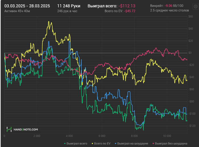 4)ну и наконец то покер. тут конечно провал полный, но вообще меня не расстраивает. играл мало, играл не оптимально и впринципе результат закономерен. постараюсь в следующем месяце посерьёзней подходить к игре.а то даже для хобби игрока какая до детская дистанция. Но кстати много занимался теорией. брал с собой ноутбук на работу и там когда было время разбирал борды, вспоминал текстуры , линии и все такое. иногда поигрывал против солвера. даже кажется что теорией занимался больше чем каткой но не считал.