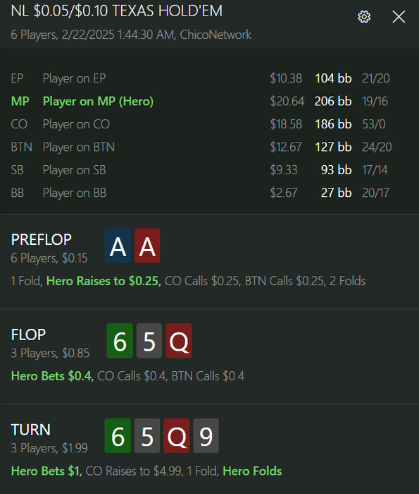 Смысла ставить больше на флопе думаю нет. На терне диапазон полярный у оппа и такой овербет скорее выглядит как защита готовой руки на микросах. По поводу моего сайзинга на терне не уверен, поставил бы 3/4 - не думаю, что оппонент бы по другому среагировал.