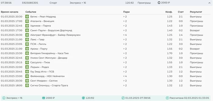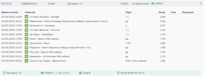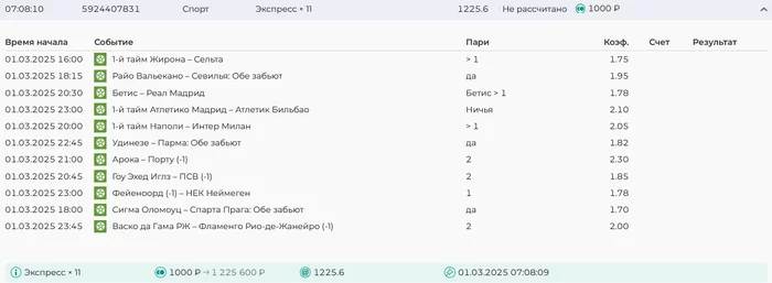 Экспрессы х10+ все проиграли, банк похудел на 60₽. Банк -4,8%.Итого банк 4760 ₽. Экспрессы на 01.03.25. Экспресс 8+1,59 флета, экспресс исх+тот -0,68 флета, экспресс тотал +0,44 флета.