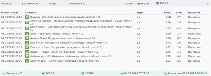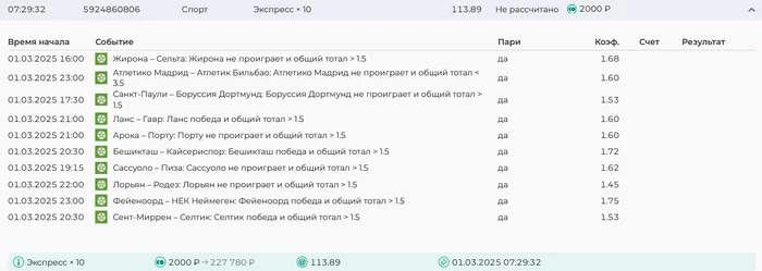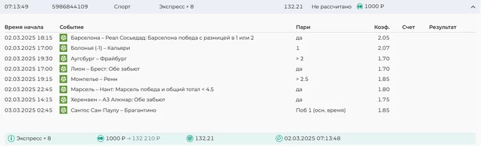 Экспрессы х10+ все проиграли кроме одного, по нему сумму выигрыша ставим дальше, что б получить х10, т.к. Были возвраты. банк похудел на 40₽. Банк -5,6%.Итого банк 4720 ₽. Экспрессы на 02.03.25. Экспресс 8+3,12 флета, экспресс исх+тот +0,62 флета, экспресс тотал +0,08 флета.