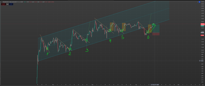 Если входить, то на пробитии трендовой на 4H периоде, дождавшись закрытия свечи выше трендовой. Стоп можно поставить ниже лоя. Риск-реверд 1 к 3 , как по классике в моментум стратегии.