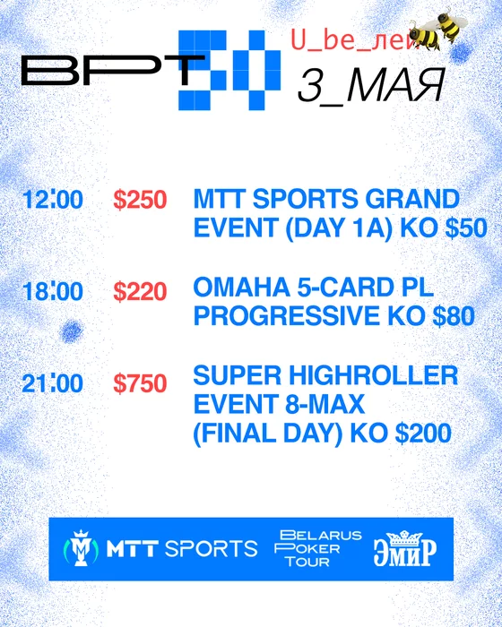 💥 В 12:00 стартует $250 MTT Sports Grand event (day 1A) KO $50. В первом входном дне отыграем 16 уровней, 12 из которых будет доступна поздняя регистрация. Закончим примерно в 20:45.