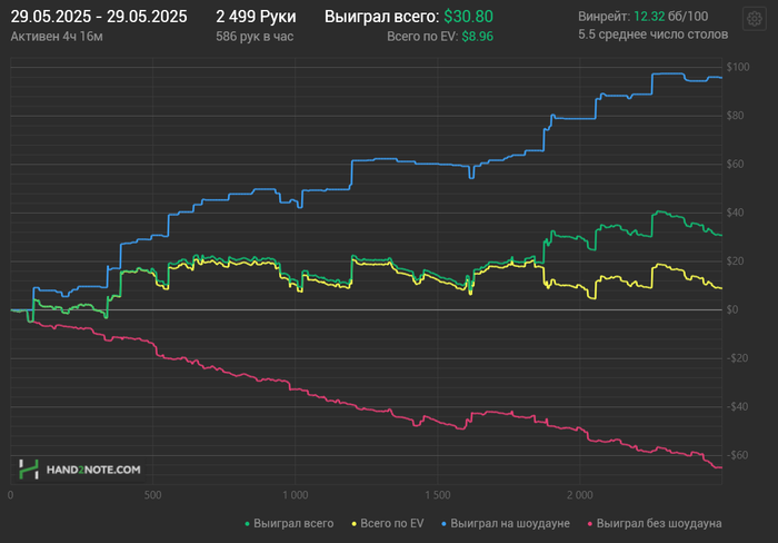 Теперь про покер, выходной от покера дал свои плоды, больше поразмыслил и над критикой и над советами постами выше. В целом согласен со всеми и соре если кого-то где-то обидел, это всё тильт. Даже писал как-будто в тильте. Полоса невезения всё-таки присутствует и из-за этого неоптимальное состояние и игра кривая и префлоп и всё из этого вытекающее. Просто я видимо с такой диспой первый раз столкнулся.