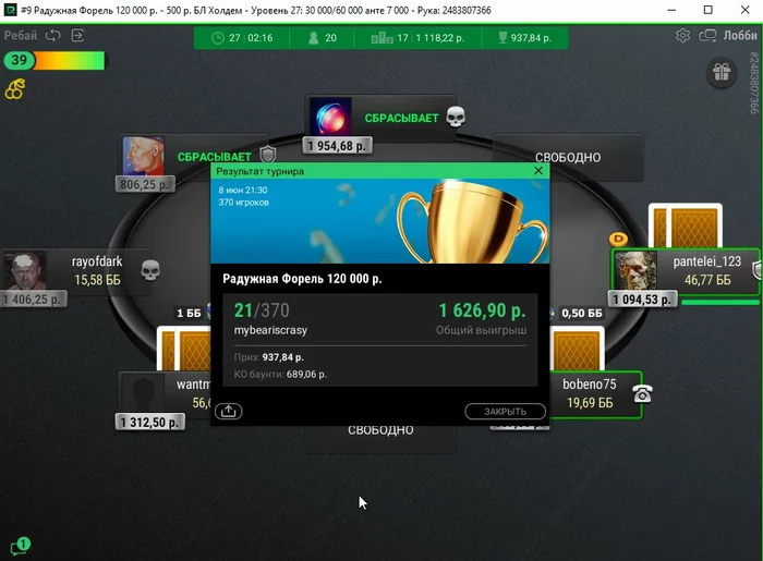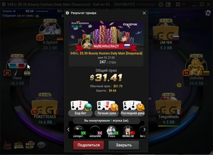 Обкатка нового рабочего места на мой взгляд прошла успешно. Состоялся дальних проход в крупном турнире на 17,5 тысяч участников. 247 место пополнила кассу на 31,5$. 💪💪💪